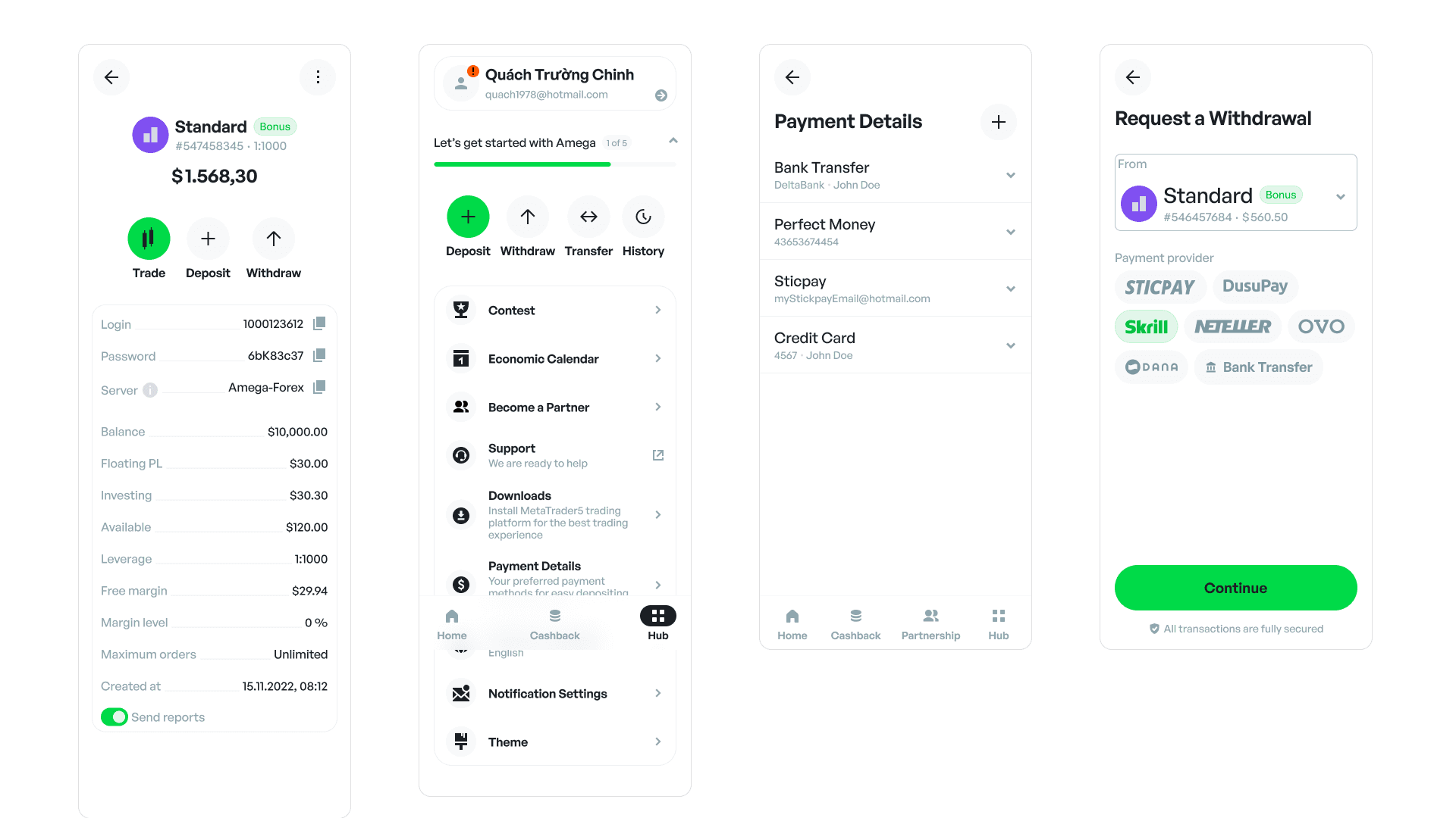 Amega’s client area served active traders managing deposits, withdrawals, KYC, referrals, account activity, and trading-related financial operations.